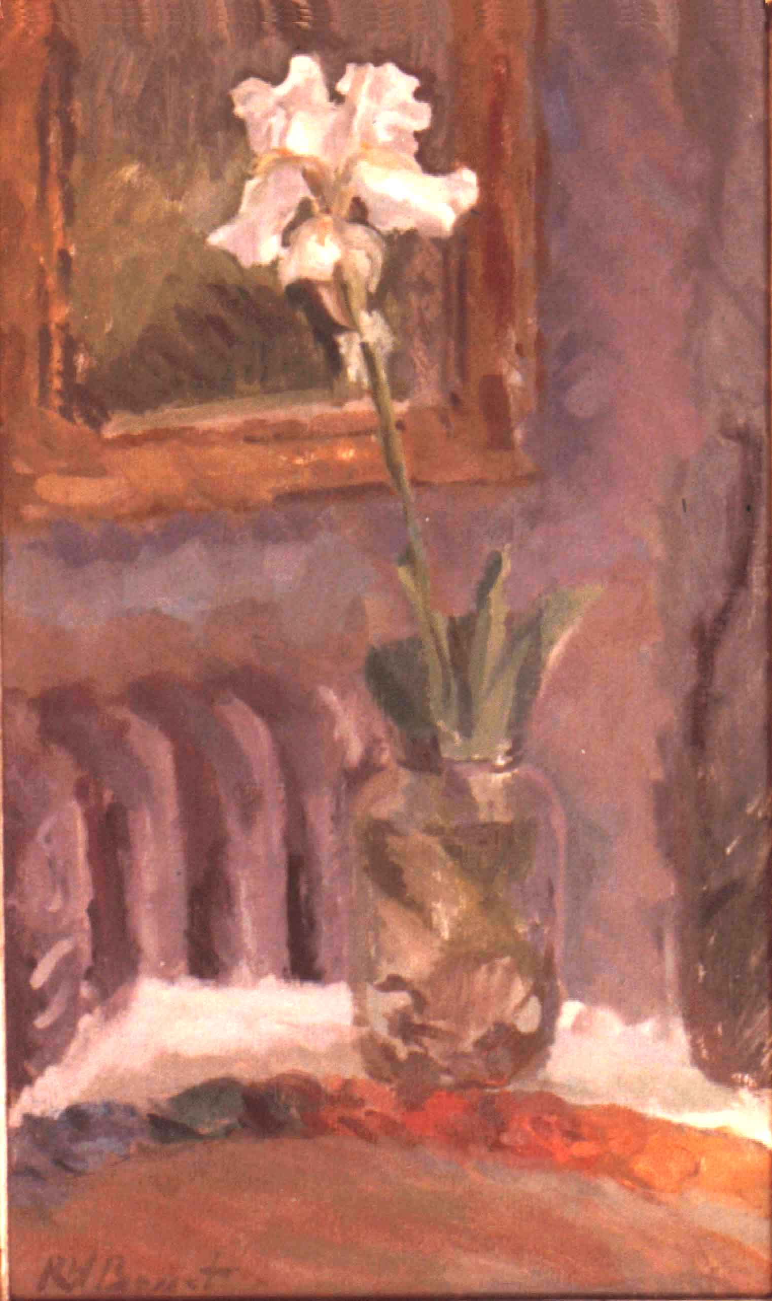 This painting was done after Basset had moved to Denver, Colorado. The influence of the English Impressionists is still evident in the handling of the symphony of greys. A certain "unfinished" quality exists in some of the surrounding spaces bearing witness to the single Iris flower being the true center of the artists attention. Click on image to see detail view.